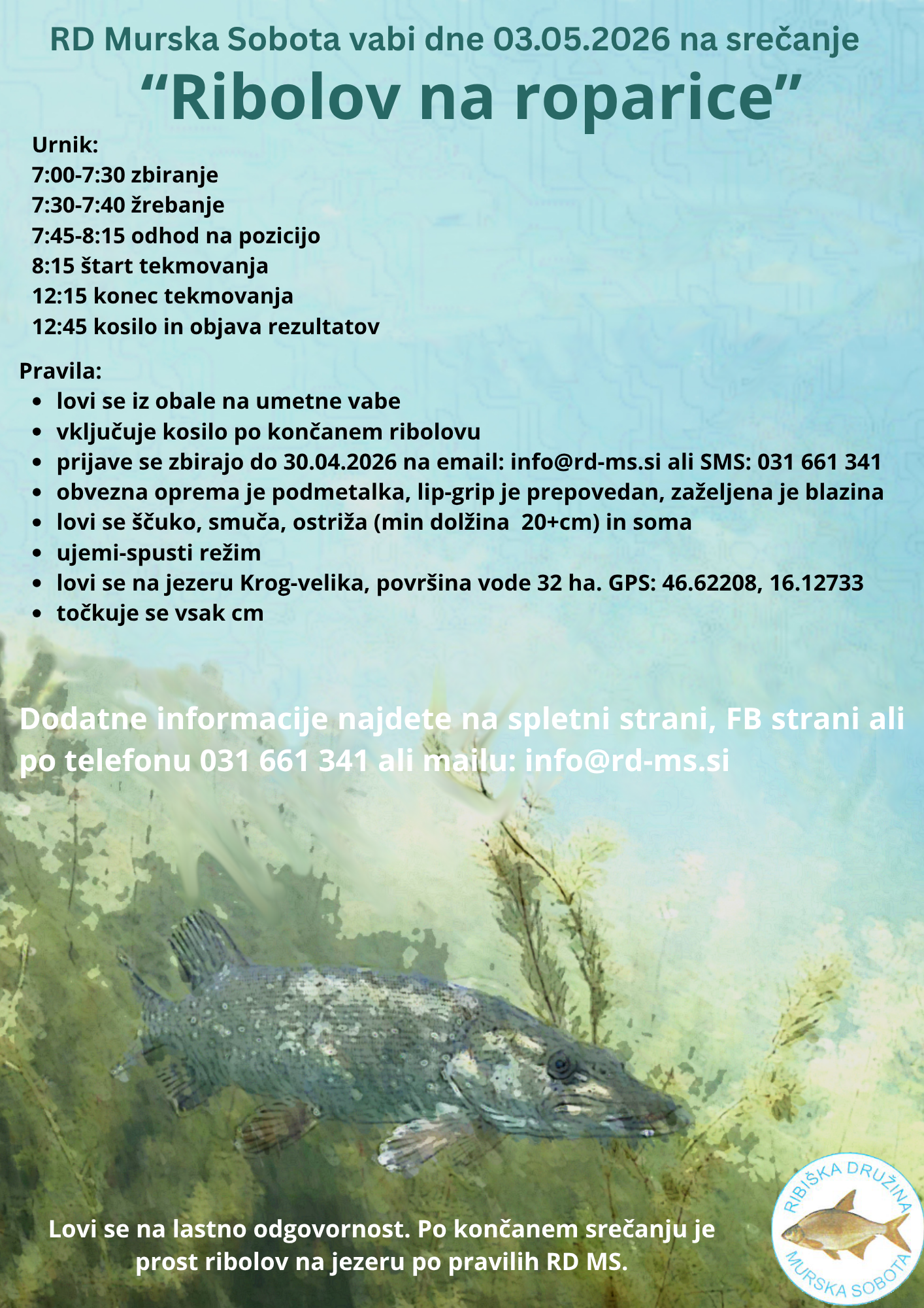 RD Murska Sobota vabi na srečanje v ribolovu roparic, ki bo 03.05.2026 z zborom ob 7.00 na gramoznici Krog velika. Lovi se s terhniko vijačenja. Prijave zbiramo do četrtka, 30.04.2026 na 031 661 341 ali na info@rd-ms.si